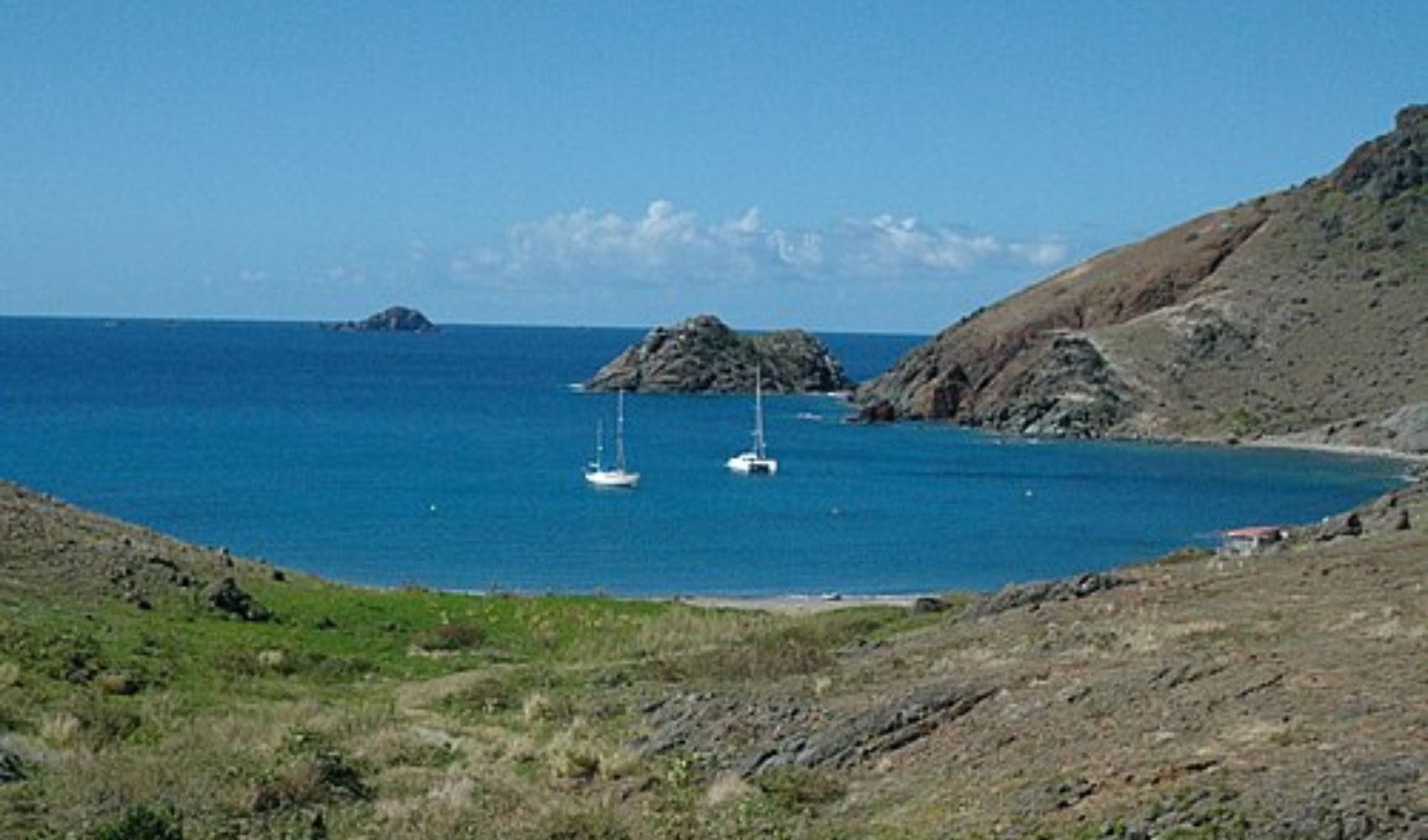 5 miles off the coast of St. Barts lies Ile Forchue, pointing into the sky with its spectacular peaks! The highest of the five reaches 103 feet. The rocky sides of the hills are covered with sparse shrubs, grasses, and cacti. The island is in a Marine park, thus uninhabited and undeveloped. Therefore, while hiking along the peaks, you may encounter tortugas, many birds, and while snorkeling in the sheltered bay, you may see sea turtles and many fish. The bay is shaped as a horseshoe, hence the name; in fact, it is a flooded caldera of the ancient volcano.